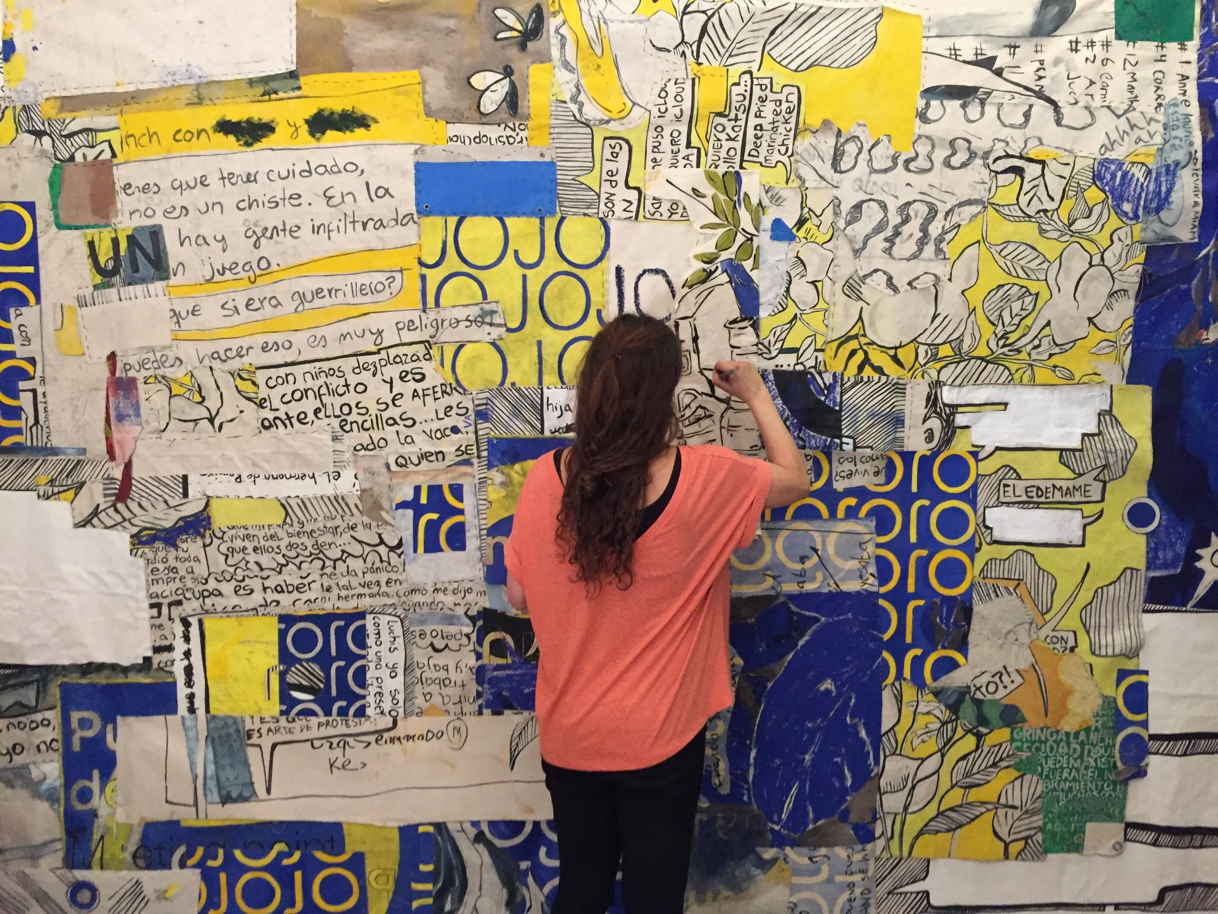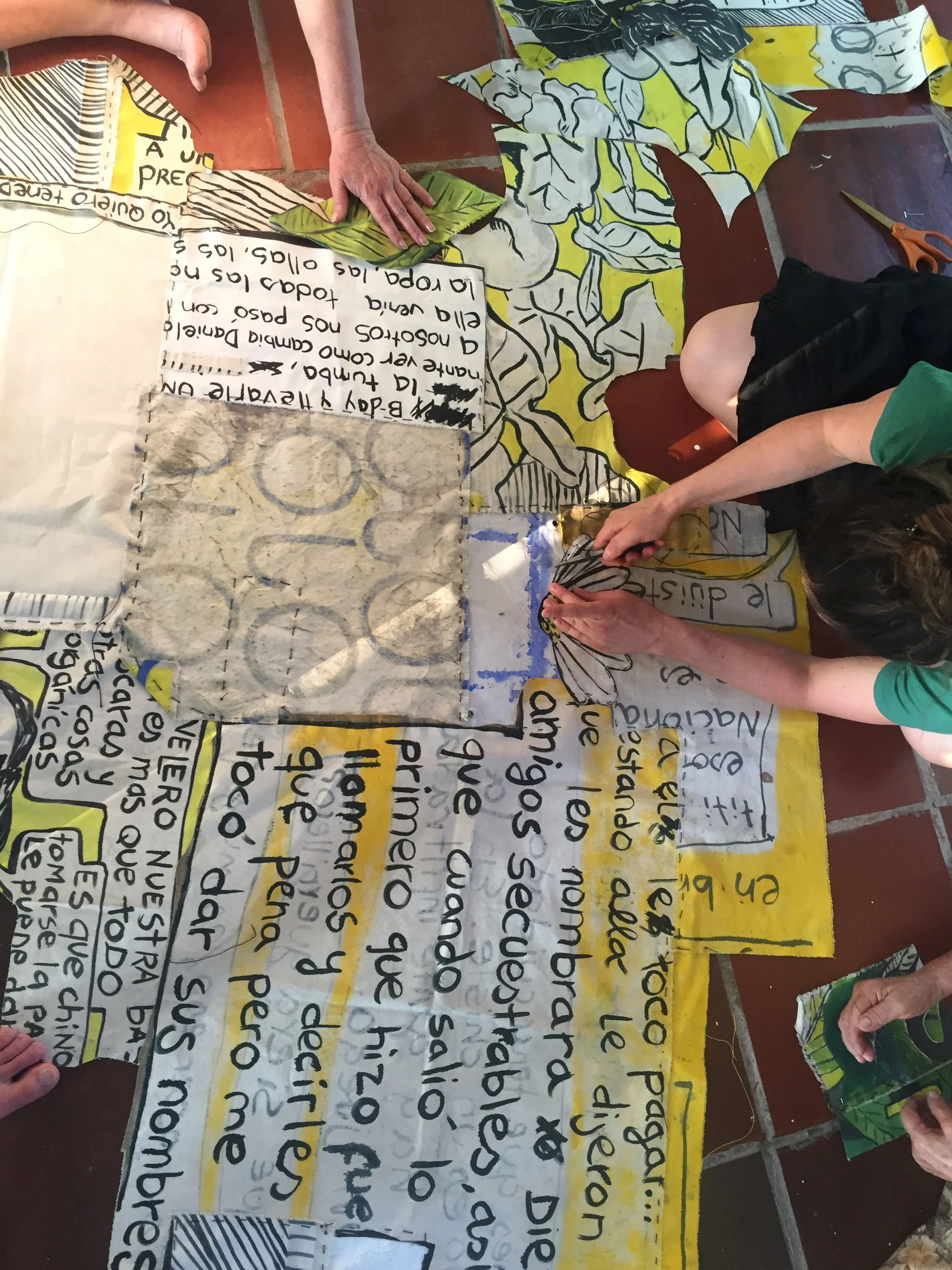 The work brings together painted fabrics based on my notebooks which record dialogues of different people around the Colombian conflict. The fabrics painted on both sides, torn and cut apart, then hand sewn in collaboration with others, alluding to an experience of life and social fabric that has been fragmented due to historical events. The work has a human scale and and remains in flux negating a fixed state, as it mutates according to the exhibition context.