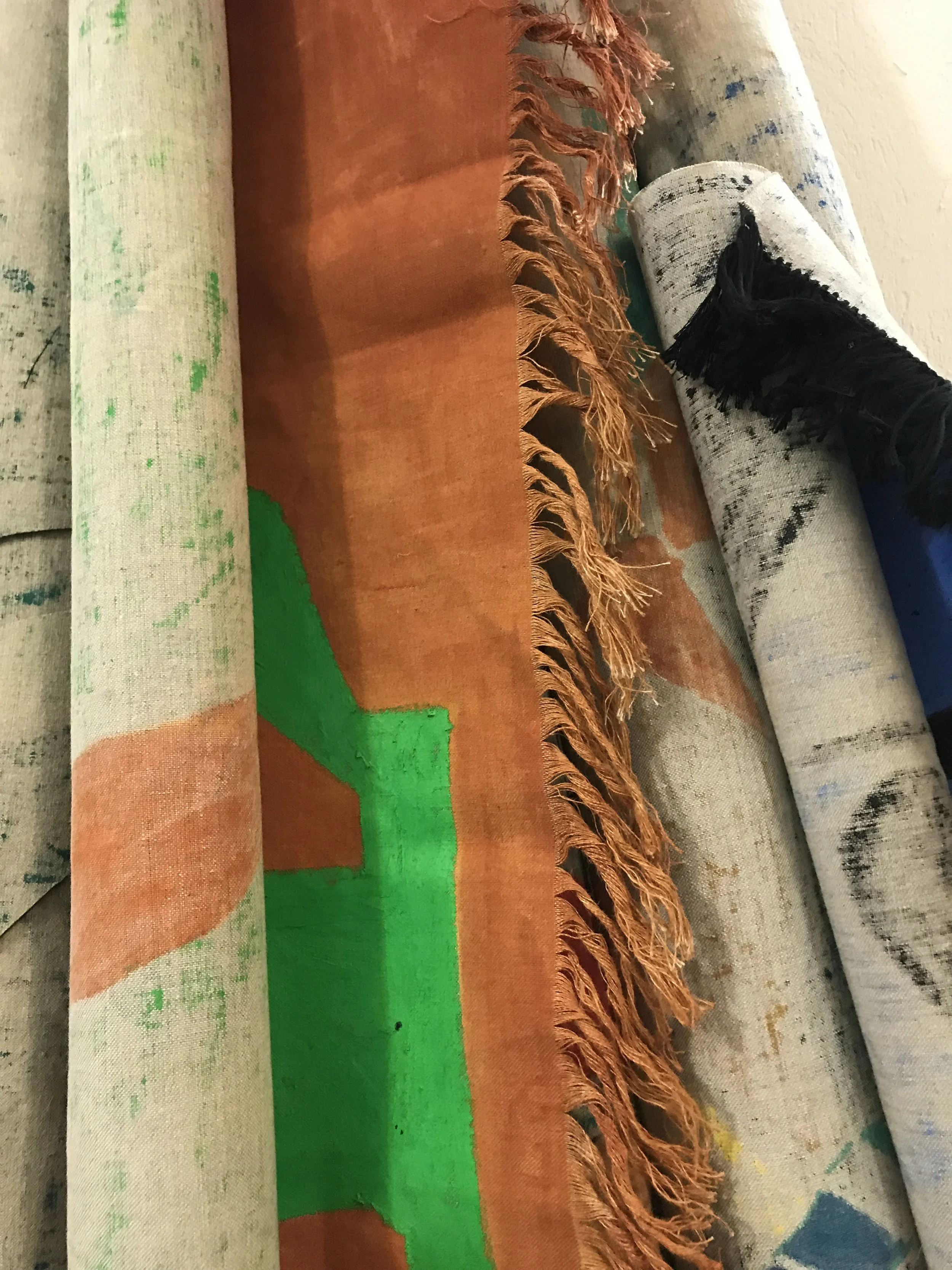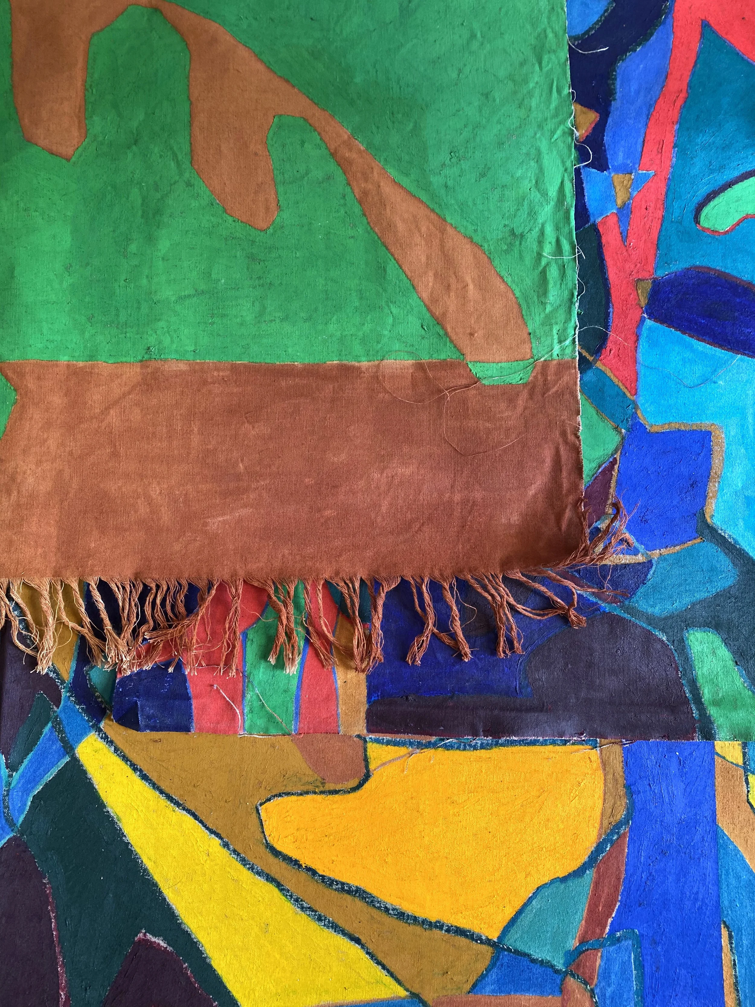 Matorrales is composed out of drawings of local vegetation made in the town of Carmen de Apicalá in Tolima, Colombia. The colors are taken from the traditional town colors. Instead of cutting, reconfiguring and sewing the fabric as in previous works, the drawings themselves are cut up and placed on a light box that projects the shadows on to the painting surface. That way the pattern is configured. The paintings are experienced as tapestries that are hung, then folded or rolled as they move through the world. They are meant to be placed layered, seen in relation to the others, not by themselves in an ever changing tapestry made up of separate elements. Though conceived as paintings they contain craft techniques, blurring the boundaries of the discipline they belong to.